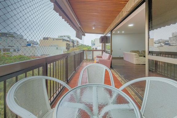 Apresentamos uma linda cobertura duplex na Quadríssima Leblon, com piscina e uma vista lateral para o mar, em um ambiente clean e bem decorado! Originalmente com 5 quartos, um dos quartos foi integrado à sala de jantar, criando um espaço ainda mais acolhedor. 1º Piso: Ao entrar, você será recebido por um amplo salão de estar, uma elegante sala de jantar e uma aconchegante saleta íntima de TV. O varandão, fechado com cortina de vidro, oferece uma vista lateral para o mar. Aqui você encontrará uma suíte com closet, mais um quarto e um banheiro social. A cozinha é repleta de armários de excelente qualidade, acompanhada de uma despensa e uma dependência completa, atualmente equipada com armários e prateleiras. 2º Piso: Este espaço conta com uma sala de estar/TV, lavabo e uma pequena cozinha gourmet. O varandão externo possui uma churrasqueira e uma refrescante piscina, além de um chuveirão em deck de madeira. A suíte master e mais um quarto, que atualmente funciona como escritório, são voltados para os fundos, garantindo tranquilidade e silêncio. A cobertura oferece uma marcenaria de alta qualidade, com hidráulica e elétrica reformadas. As duas vagas de garagem são livres, sem necessidade de manobrista. O prédio conta com portaria 24 horas e um espaço de play. Os direitos de promover obras de modificações, ampliações ou acréscimos na laje superior da cobertura estão assegurados ao proprietário em caráter perpétuo. Com uma fachada em granito que confere um visual elegante e sofisticado, esta cobertura semi-luxo possui 285 m² de área total, sendo 285 m² de área útil, ideal para receber amigos e familiares com todo o conforto. Aproveite a excelente incidência de sol, que proporciona iluminação natural durante toda a manhã e tarde. Não perca a chance de conhecer este imóvel incrível e viver momentos inesquecíveis em um ambiente único e acolhedor. Agende sua visita agora mesmo! Ainda não encontrou o imóvel perfeito? Nós somos especialistas em imóveis de alto padrão nas melhores localizações do Leblon! Entre em contato conosco! Oferecemos um atendimento excepcionalmente personalizado, realizando uma busca detalhada e um mapeamento de mercado para identificar propriedades que se encaixem perfeitamente no seu perfil. Visite nosso site e descubra o nosso jeito com Alma de trabalhar :) Estamos prontos para transformar sua busca em uma experiência inesquecível!