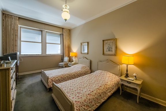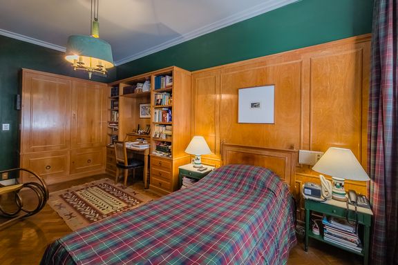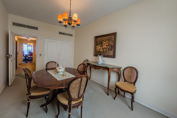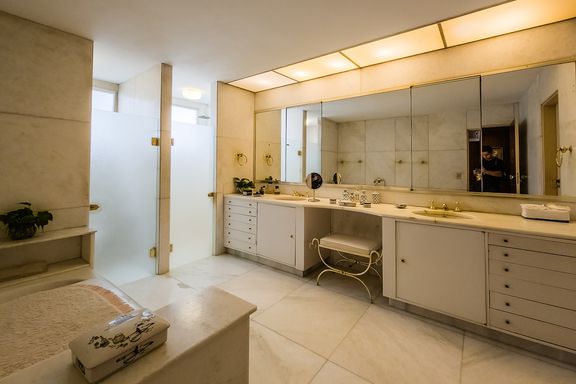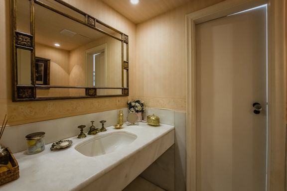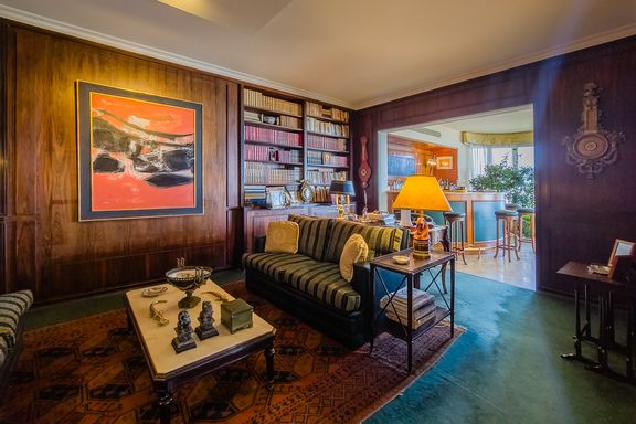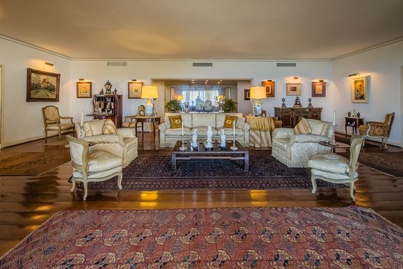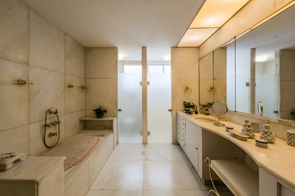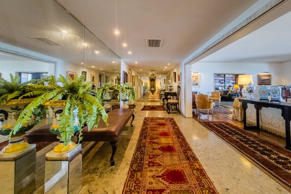 A área social é marcada por um hall privativo que se abre para uma ampla galeria de entrada, conectando-se às salas de estar e jantar — ambas com longos pisos de tábua corrida e janelas que emolduram o mar. Uma biblioteca revestida em lambri de jacarandá adiciona um toque de sofisticação atemporal. Na frente, uma varanda com piso em mármore percorre toda a extensão do apartamento, abrigando um jardim de inverno e um bar, de onde se tem uma vista espetacular da Praia e Pedra do Arpoador, alcançando o Morro Dois Irmãos e a Pedra da Gávea.